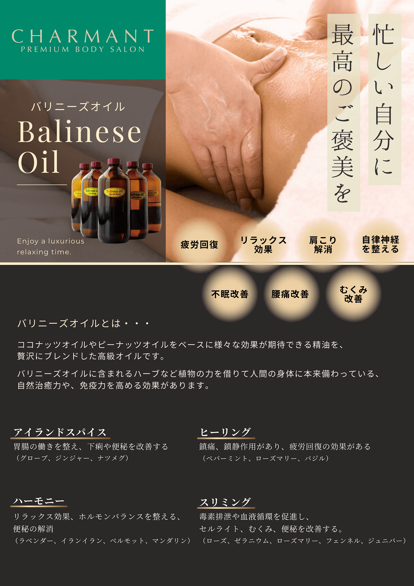 当サロンの痩身オイルリンパマッサージは、筋肉・むくみ・脂肪の状態を見極めながら行うオーダーメイド施術。深層部まで届くハンドテクニックで巡りを整え、固まった脂肪を柔らかくほぐし、流し、引き締めます。「冷えやすい」「むくみやすい」そんな体質の方にもおすすめです。